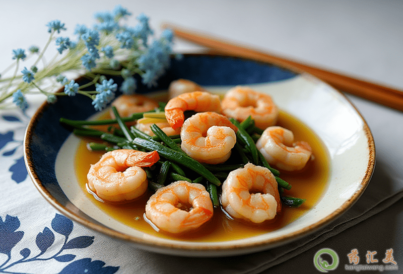 韭菜炒蝦肉,使用新鮮的蝦與韭菜、生姜以及適量的精鹽,把蝦的腸與殼去掉后清洗干凈,再把姜片放到鍋里面暴香,之后把蝦放進去并炒到八成熟時,再把韭菜放進去,稍微炒一下之后再加入適量的精鹽就可以了,這個菜有著溫中行氣以及固精止遭的作用。