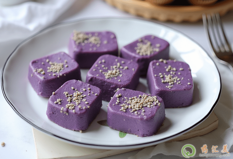 1、紫薯洗凈、切兩半,入鍋蒸熟,取出去掉皮。2、蒸好的紫薯壓成泥狀。