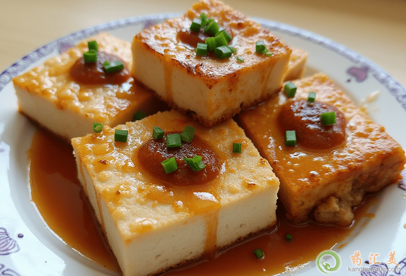 6. 豆腐上再撒上蔥末、姜末、味精、精鹽、醬油、黃酒浸好;