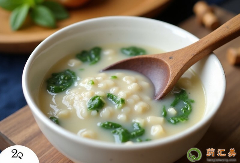 3、煮20分鐘待米粒破開后,放入青菜碎,鹽,雞精,攪拌均勻后即可。