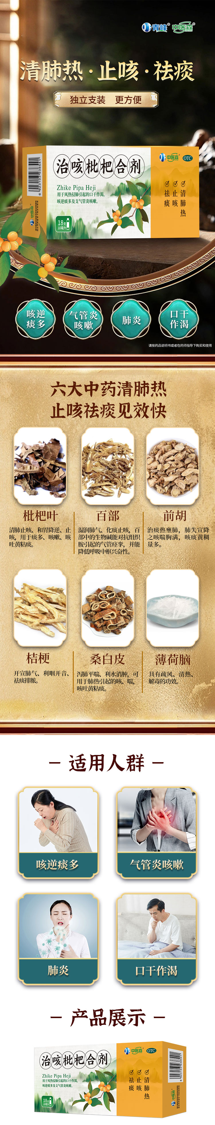 【商品成分】枇杷葉、百部、前胡、桔梗、桑白皮、薄荷腦。輔料為蔗糖、苯甲酸鈉、檸檬酸、杏仁香精、楊梅香精、純化水。