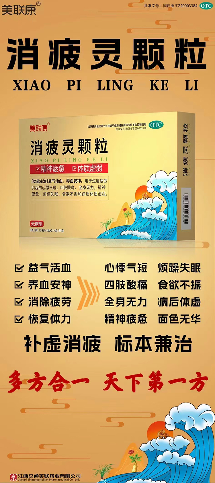 答消疲靈顆粒是正規國藥準字號中成藥,國藥準字號是:國藥準字Z20003384。消疲靈顆粒-無糖型是江西京通美聯藥業有限公司生產的6g*10袋*2小盒裝的消疲靈顆粒,消疲靈顆粒可以益氣活血,養血安…