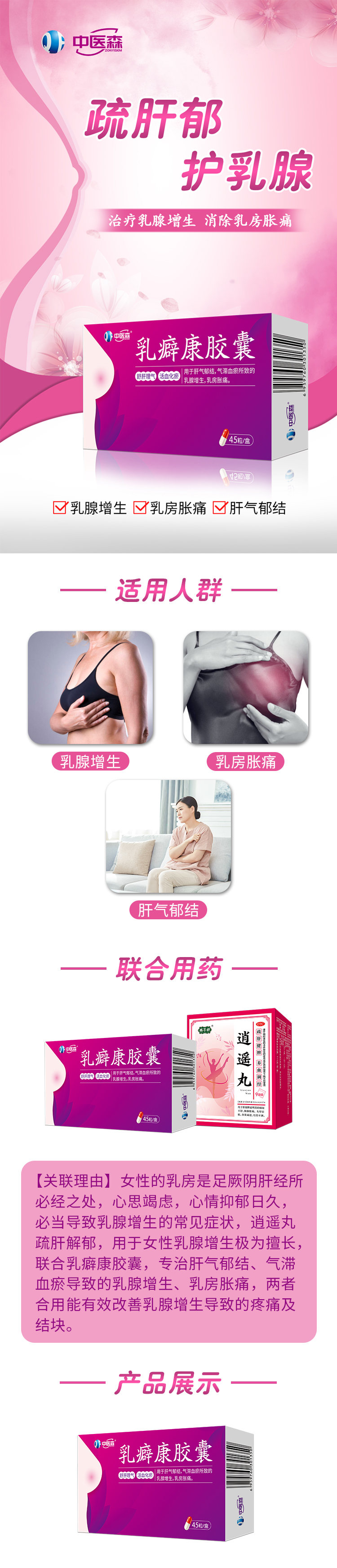 女性的乳房是足厥陰肝經(jīng)所必經(jīng)之處,心思竭慮,心情抑郁日久,必當(dāng)導(dǎo)致乳腺增生的常見(jiàn)癥狀,逍遙丸疏肝解郁,用于女性乳腺增生極為擅長(zhǎng),聯(lián)合乳癖康膠囊,專治肝氣郁結(jié)、氣滯血瘀導(dǎo)致的乳腺增生、乳房脹痛,兩者合用能有效改善乳腺增生導(dǎo)致的疼痛及結(jié)塊。