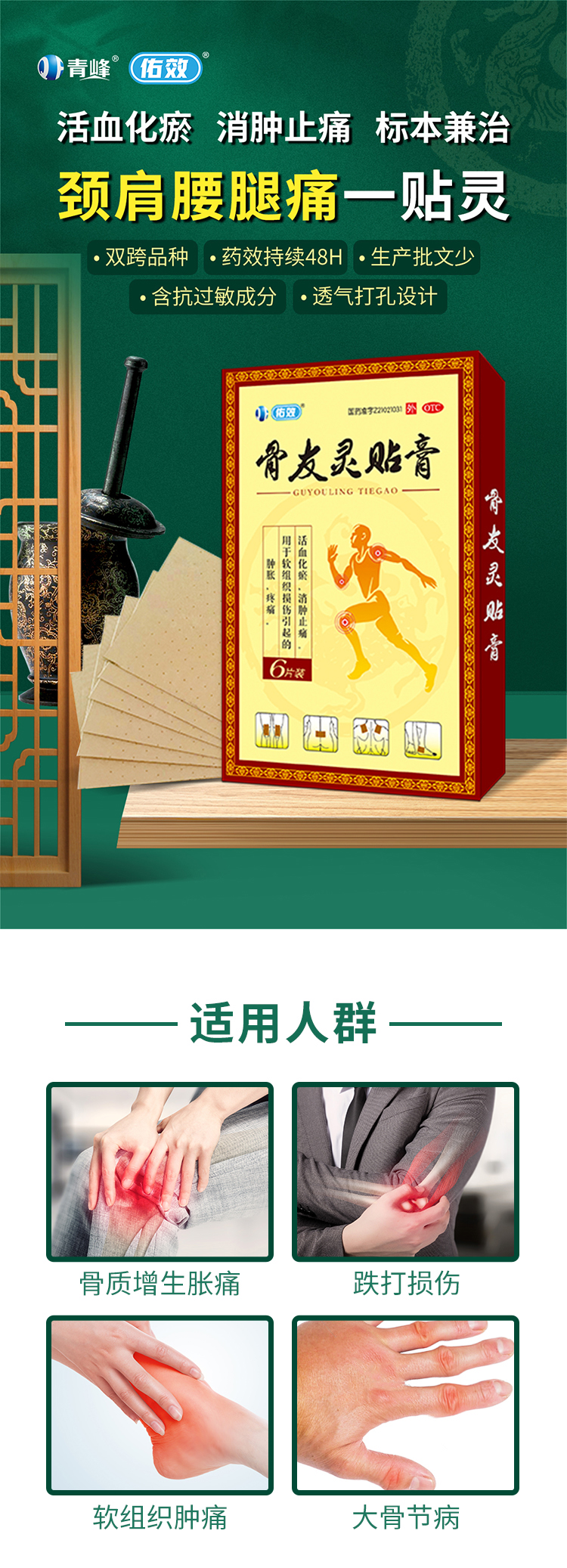 1、骨質(zhì)增生脹痛:骨友靈貼膏+抗骨增生片