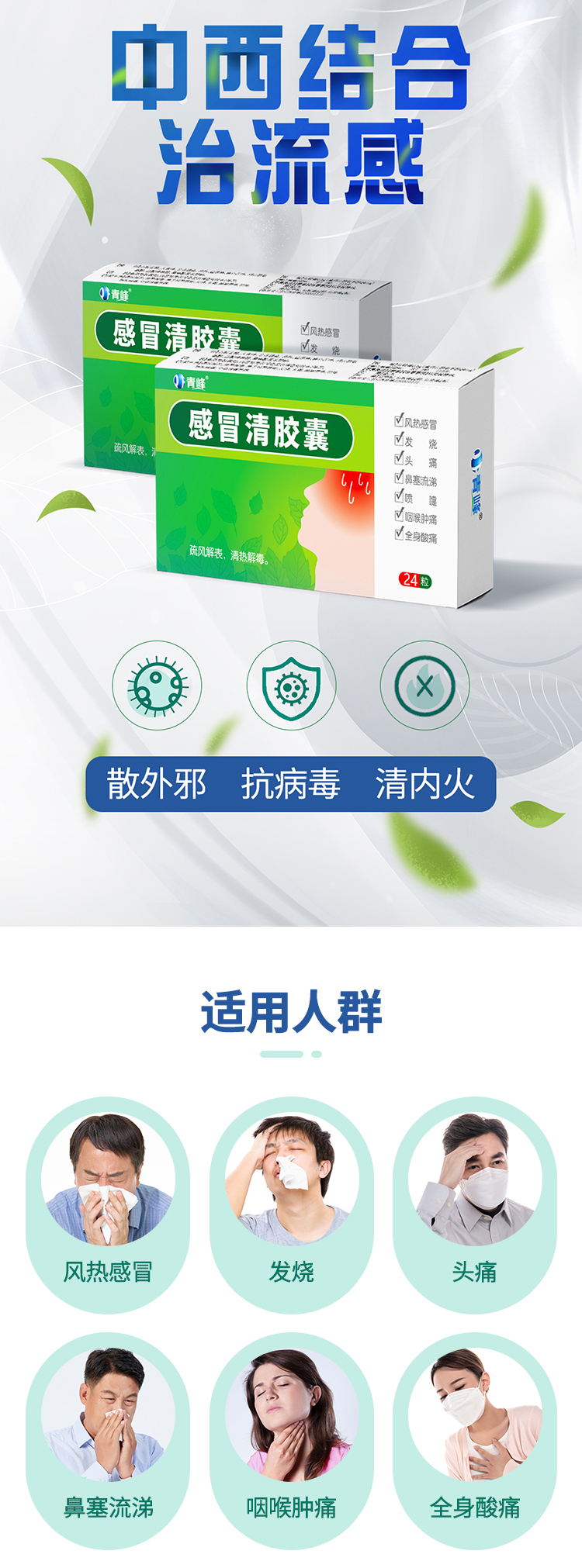 【功能主治】疏風解表,清熱解毒。用于風熱感冒,發(fā)燒,頭痛,鼻塞流涕,噴嚏,咽喉腫痛,全身酸痛等癥。